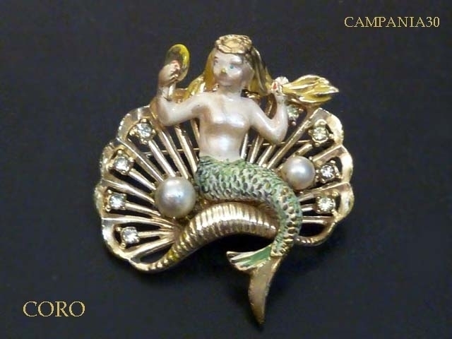 Deliziosa e rara spilla in metallo dorato, perle e strass con finiture in smalto realizzata da Coro negli anni '40 su disegno da Adolph Katz. Misura 4 x 4,5 cm ed è in ottime condizioni. Da collezione!!